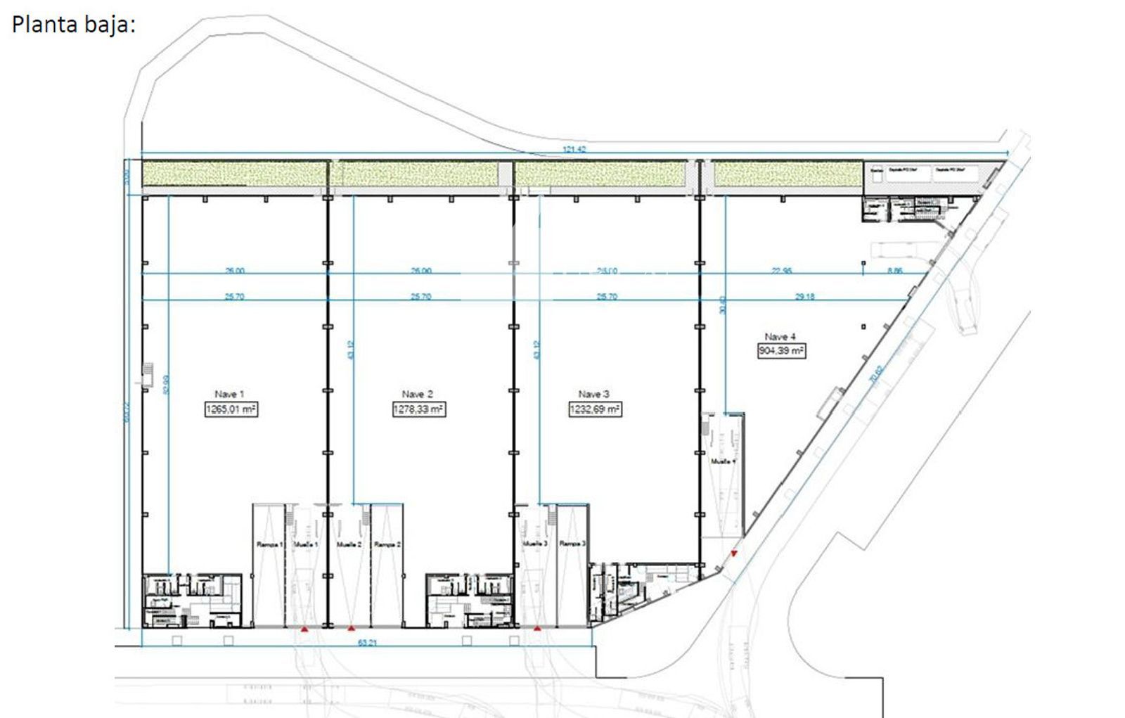 4 muelles de carga, 4 puertas TIR, rampa de acceso desde la calle (una por nave)